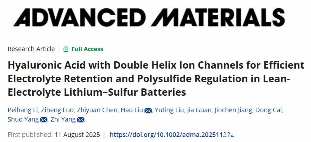 该工作以“Hyaluronic Acid with Double Helix Ion Channels for Efficient Electrolyte Retention and Polysulfide Regulation in Lean-Electrolyte Lithium–Sulfur Batteries”为题发表在国际顶级材料期刊《Advanced Materials》上。开云网页版页面登录作为第一通讯单位。第一作者为我校化学与材料工程学院2022级硕士研究生李佩航,该生已经进入日本东北大学化学工程专业深造博士学位。我校化学与材料工程学院杨植教授、电气与电子工程学院杨硕副教授、济南大学刘浩博士为共同通讯作者。我校蔡冬副教授、贯佳副教授,本科生罗子恒,博士研究生陈志远,以及硕士研究生刘雨婷、蒋金晨参与了本项研究的相关工作。