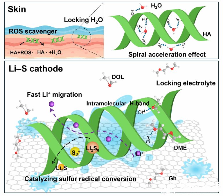 近日,受到天然保湿材料解决人体皮肤缺水问题的启发,我校杨植教授、杨硕副教授与济南大学刘浩博士合作,提出一种创新性策略:将天然保湿材料——透明质酸HA作为催化剂引入硫阴极,实现高性能锂硫电池。实验和分子动力学模拟结果表明,HA可以通过其双螺旋结构中的分子内氢键牢牢的吸附电解液,确保电解液与电极表面充分接触,营造局部电解液充足的反应微环境;同时,HA的N位点能够吸附并催化多硫化物的可逆转化;此外,HA独特的双螺旋结构凭借螺旋加速效应促进了Li+的传输。在三重协同作用下,电池性能得到显著提高。CNT−S/HA阴极(约80 wt%硫含量)表现出良好的初始容量、高倍率性能以及长循环寿命。特别是在硫负载为8 mg cm−2、E/S比为3 μL mg−1的贫电解液条件下,锂硫软包电池实现了11.76 mAh cm−2的高面积容量,能量密度达到409 Wh kg−1。此外,1.5 Ah软包电池可驱动无人机续航20分钟,续航时间远超传统锂电池约4倍。该工作为开发天然保湿材料在下一代储能设备中的应用开辟了创新途径。