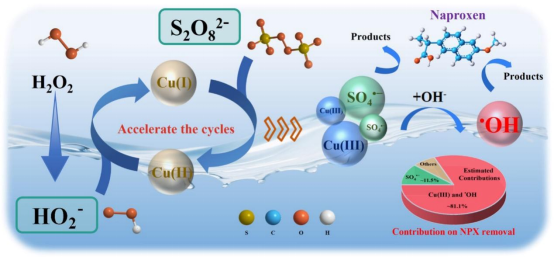 还原剂和螯合剂被广泛用于增强Cu(II)/H2O2工艺的氧化能力。然而,其二次污染风险和对活性物质的强清除作用严重限制了其在污水处理中的应用。提出了在Cu(II)/H2O2工艺中添加氧化剂(如过氧化物二硫酸氢钠(PDS))以增强有机污染物氧化的新策略。以萘普生(naproxen,NPX)为目标污染物,PDS的引入提高了Cu(II)/H2O2过程中NPX在pH为7.0~10.5范围内的降解效率,提高了氧化剂的利用效率(超过7倍)。更重要的是,去质子化H2O2(HO2-)作为还原剂(而非氧化剂)在PDS/Cu(II)/H2O2过程中对Cu(II)还原为Cu(I)起着至关重要的作用。PDS优先于H2O2与生成的Cu(I)反应生成•OH、SO•− 4和Cu(III)等多种反应组分。PDS/Cu(II)/H2O2过程对常见的天然无机离子(如NO- 3、HCO- 3)和腐殖酸也表现出良好的抗干扰性。此外,根据检测到的7种降解中间体,提出了两种可能的转化途径,并没有观察到明显的毒性变化。