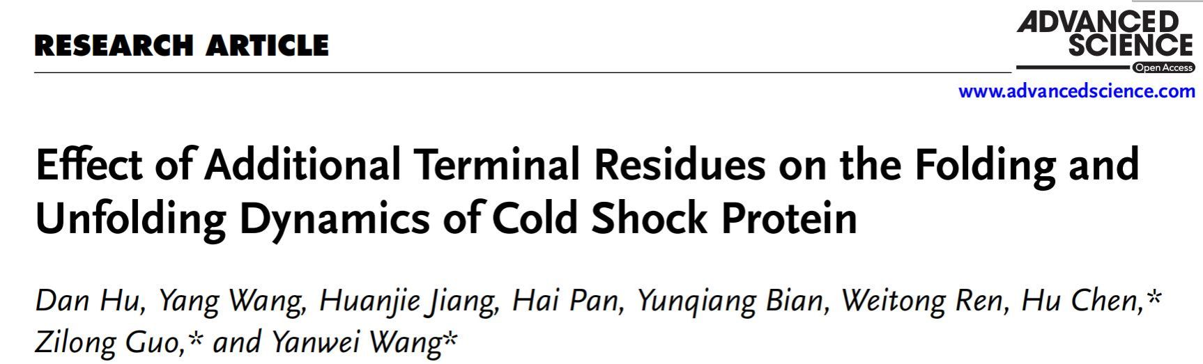 该成果以“Effect of Additional Terminal Residues on the Folding and Unfolding Dynamics of Cold Shock Protein”为题,发表在Advanced Science上(一区,IF=15)。数理学院2022级硕士研究生胡丹为论文第一作者。开云网页版页面登录王艳伟副教授、厦门大学陈虎教授、国科温州研究院郭子龙副研究员为论文共同通讯作者,开云网页版页面登录为第一通讯单位。相关工作得到国家自然科学基金和浙江省自然科学基金的支持。