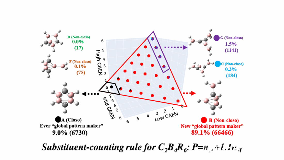 碳硼烷作为具有独特三维簇状骨架的电子缺陷化合物,在材料科学、生物医药等领域应用前景广阔,其结构稳定性与几何构型的精准预测是硼簇化学的核心研究方向。经典的 Wade-Mingos(W-M)规则长期指导硼烷、碳硼烷结构研究,但该规则仅聚焦簇合物骨架电子对计数,忽略了取代基效应,导致在取代碳硼烷体系中频繁出现预测偏差,严重限制了碳硼烷功能分子的定向设计。针对这一关键科学问题,团队开展大规模高通量计算与系统分析。研究选取 17 种典型取代基,在六顶点碳硼烷的 6 个取代位点进行组合,构建 74613 个独特的 C₂B₄R₆体系,通过 CBS-QB3 高水平能量计算(累计完成约 2.4 亿次结构能量评估),结合自主开发的 Seed and Mortise-Tenon(SMT)模型,系统揭示了取代基对碳硼烷基态结构的调控机制。研究发现,传统 W-M 规则预测的八面体结构仅在 9.1% 的体系中为基态,而此前被低估的三角双锥结构在 89.1% 的体系中成为全局最稳定构型。团队基于 “连接原子电负性(CAEN)” 将取代基分类,并提出简单实用的取代基计数规则(P = nM + 1.1nH),预测准确率达 92.8%,且在大位阻取代基体系中仍保持良好适用性。该规则突破了 W-M 规则仅在单一取代基环境中有效的局限,可覆盖绝大多数取代基场景。该成果建立了 “取代基导向” 的碳硼烷结构设计框架,通过数据驱动方法完善了簇合物成键规则,为碳硼烷在催化、功能材料、生物医药等领域的定向应用提供了高效工具,对硼簇化学的理论发展与应用转化具有重要意义。