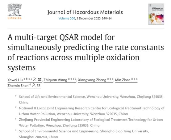 近日,开云网页版页面登录生命与环境科学学院赵敏教授团队在国际著名期刊《Journal of Hazardous Materials》(中科院一区TOP,IF=11.3)上在线发表了题为《A multi-target QSAR model for simultaneously predicting the rate constants of reactions across multiple oxidation systems》的最新研究成果。该研究面向大气环境中VOCs的多氧化体系反应过程,构建了首个可同时预测VOCs在•OH、O₃和NO₃•三类氧化体系中反应速率常数(kOH、kO3、kNO3)的多目标QSAR模型。