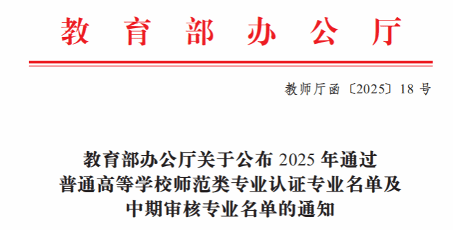 近日,教育部办公厅公布了2025年通过普通高等学校师范类专业认证专业名单及中期审核专业名单(教师厅函〔2025〕18号),我校应用心理学专业正式通过教育部师范类二级认证,有效期从2025年9月到2031年8月。这代表我校具备认证资格的15个师范专业全部通过了教育部师范类二级认证,我校师范类专业认证工作取得了突破性成效。随文还公布了我校思想政治教育、教育技术学和汉语言文学3个师范专业通过了中期审核,继续保持认证有效期。