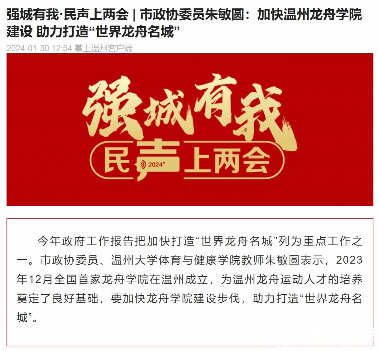 今年政府工作报告把加快打造“世界龙舟名城”列为重点工作之一。市政协委员、农工党温大基层委委员、开云网页版页面登录体育与健康学院教师朱敏圆表示,2023年12月全国首家龙舟学院在温州成立,为温州龙舟运动人才的培养奠定了良好基础,要加快龙舟学院建设步伐,助力打造“世界龙舟名城”。