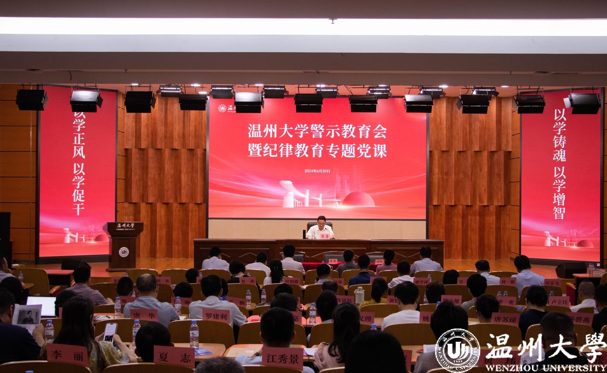钱强讲授纪律教育专题党课并讲话。他指出,习近平总书记关于全面加强党的纪律建设的重要论述为我们开展党纪学习教育特别是警示教育立起了政治标准、提供了思想武器、明确了实践要求。我们要原原本本学、循迹溯源学、带着感情学,深刻领会加强纪律建设是全面从严治党的治本之策的重要论述,准确把握加强纪律建设的重大意义;党纪学习教育开展以来,全校各级党组织和广大党员干部根据部署要求,扎实开展“潜心学纪、笃行知纪、立规明纪、知戒守纪、正风肃纪”五大行动,取得了实实在在的成效;把纪律教育作为学校新一届中层干部首次集中学习活动的主题,带领干部进一步树牢纪律意识、严守党纪要求、加强警示教育,非常及时,很有必要。