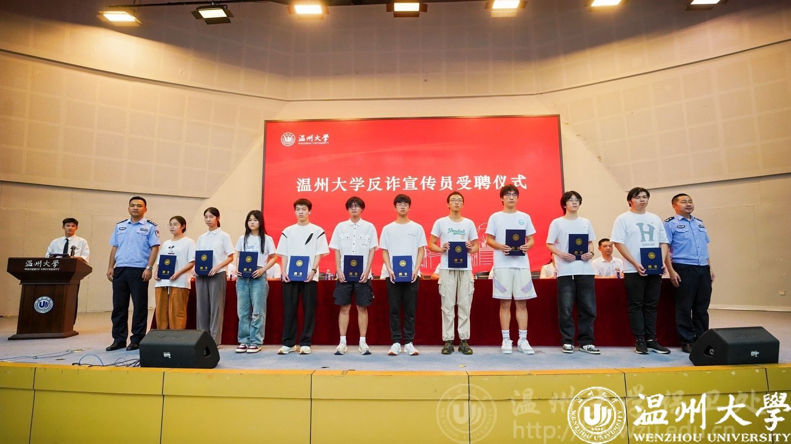 茶山派出所教导员张朝晖、温州市反诈中心警官刘昱洲为各学院学生代表颁发“开云网页版页面登录反诈宣传员”聘书,并呼吁我校师生积极参与反诈宣传中,为平安温大贡献青春力量。