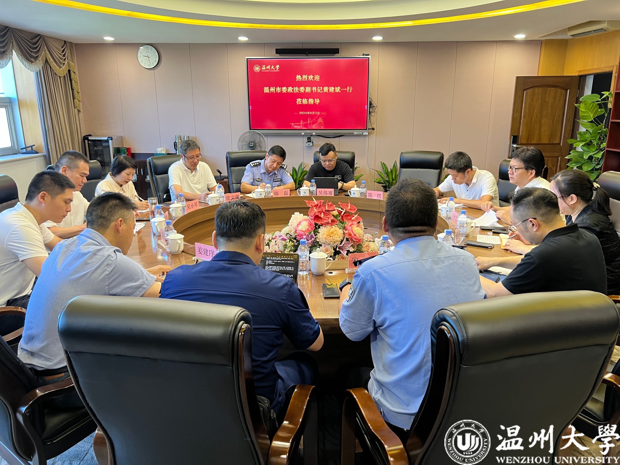 8月2日上午,温州市委政法委副书记黄建斌一行莅临我校调研平安校园创建工作。我校党委副书记庄兴忠、相关部门、学院负责人陪同调研并进行座谈交流。