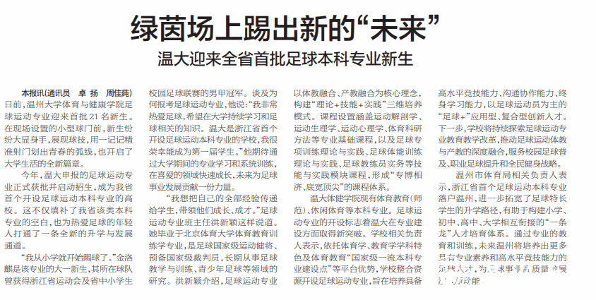 温大体健学院现有体育教育(师范)、休闲体育等本科专业。足球运动专业的开设标志着温大在专业建设方面取得新突破。学校相关负责人表示,依托体育学、教育学学科特色及体育教育“国家级一流本科专业建设点”等平台优势,学校整合资源开设足球运动专业,旨在培养具备高水平竞技能力、沟通协作能力、终身学习能力,以足球运动员为主的“足球+”应用型、复合型创新人才。下一步,学校将持续探索足球运动专业教育教学改革.推动足球运动体教与产教的深度融合,服务校园足球普及、职业足球提升和全民健身战略。