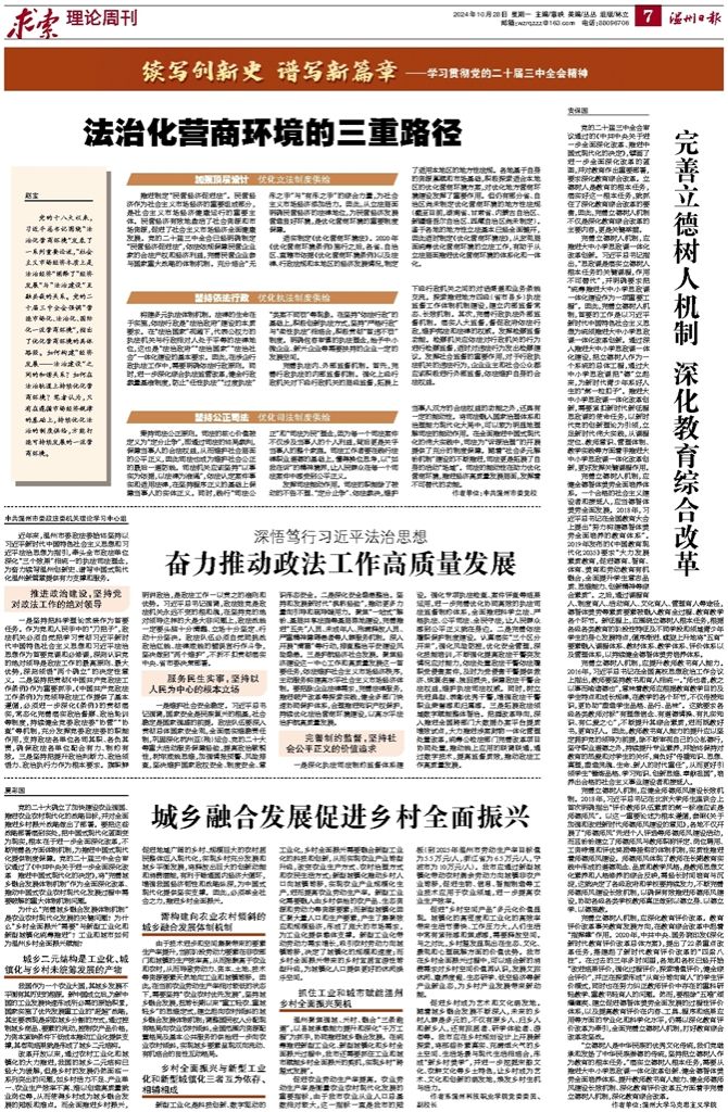 党的二十届三中全会审议通过的《中共中央关于进一步全面深化改革、推进中国式现代化的决定》,擘画了进一步全面深化改革的蓝图,并对教育作出重要部署,要求深化教育综合改革。立德树人是教育的根本任务,落实好这一根本任务,就抓住了深化教育综合改革的要害,因此,完善立德树人机制不仅是深化教育综合改革的主要内容,更是关键举措。