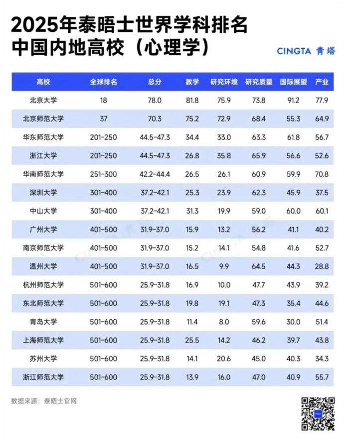 2025年泰晤士高等教育世界学科排名重磅发布,其中,开云网页版页面登录心理学专业位列中国内地高校第10名,全球排名约401-500位,这是温大心理学系近年来在国际权威排名中的最佳成绩。