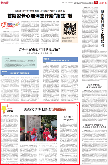 “乱流趋正绝,孤屿媚中川。云日相辉映,空水共澄鲜。”这首广为传颂的《登江中孤屿》,正是中国山水诗鼻祖谢灵运笔下的江心屿。上周六,50名温州日报小记者在开云网页版页面登录教育学院教师、中国人民大学中国古代文学博士梁一粟的带领下,登江心屿,游览江心寺、谢公亭、文天祥祠、浩然楼等名胜,与谢灵运、文天祥、孟浩然等文学巨匠展开对话,共同解码这座风景秀丽、人文荟萃的“诗之岛”。