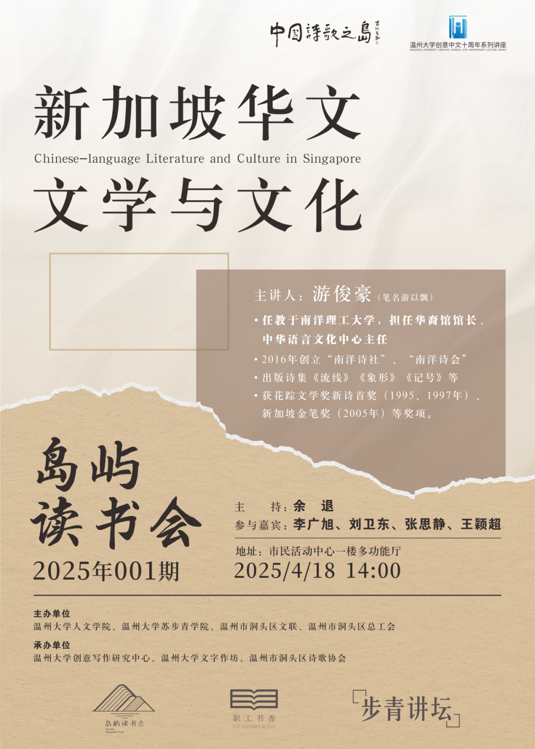 在“世界读书日”即将到来之际,4月18日,温州市洞头区首期“岛屿读书会”在区市民活动中心隆重举行。本次活动以“新加坡华文文学与文化”为主题,由温州市洞头区文联联合开云网页版页面登录人文学院、区总工会等多家单位共同主办,标志着洞头这座“中国诗歌之岛”再添文化盛事。